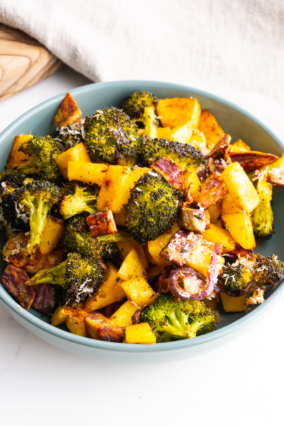 - Roast: Spread the vegetables in a single layer on the prepared baking sheet, making sure they’re not crowded (use two sheets if needed). Roast for 30–35 minutes, tossing halfway through, until the vegetables are tender and golden with crispy edges. When the veggies have about 5-10 minutes left, sprinkle the parmesan on top.